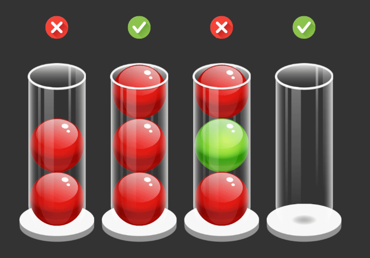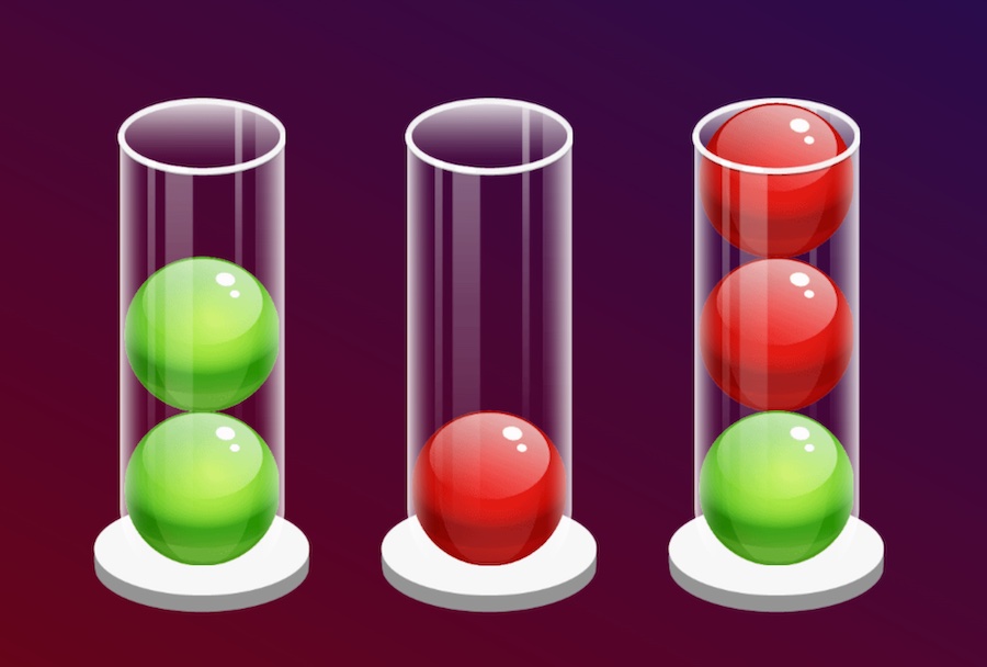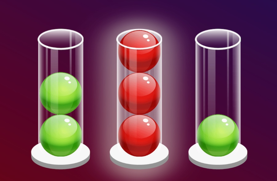 Соберите шарики одного цвета в одной колбе, чтобы очистить уровень. Перемещайте шарики между колбами, следуя правилам.
